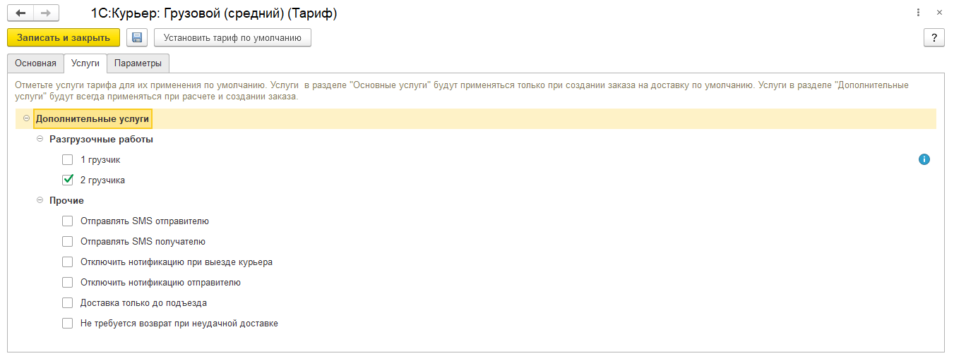Для грузовых тарифов предусмотрены дополнительные услуги – возможность заказать одного или двух грузчиков. Данные услуги можно задать по умолчанию, чтобы не указывать их каждый раз.