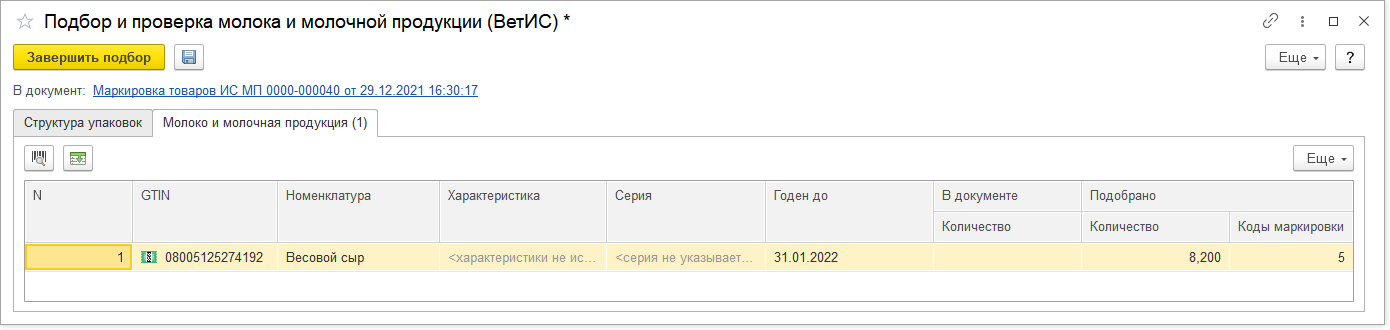 Если для вида продукции создана хотя бы одна карточка весовой номенклатуры, то на закладке с итогами подбора колонка Подобрано разделяется на 2 поля:
