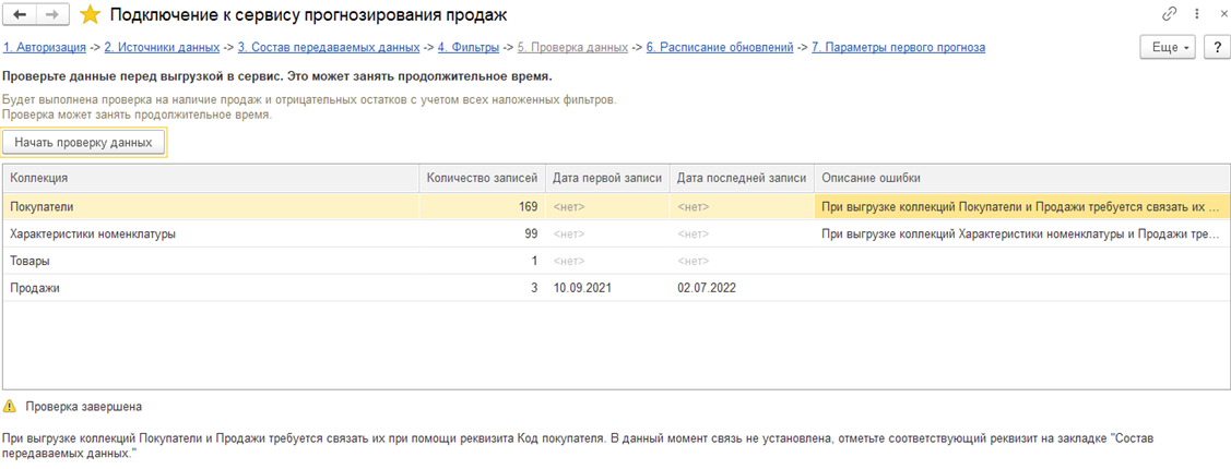 На закладке Контроль данных есть сводная информация по выгружаемым коллекциям. Таким образом, можно не только проконтролировать наличие ошибок в настройках, но и оценить изменение объема выгружаемых данных после настройки отборов.