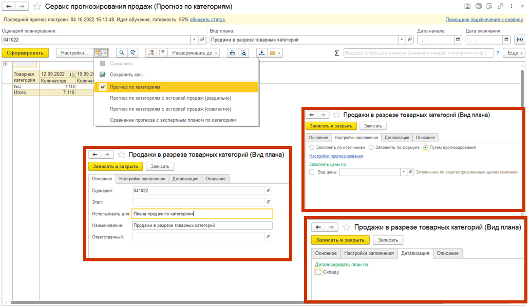 В рабочем месте Сервис прогнозирования продаж предусмотрены дополнительные варианты отчета, необходимые для вывода прогнозов в разрезе товарных категорий.