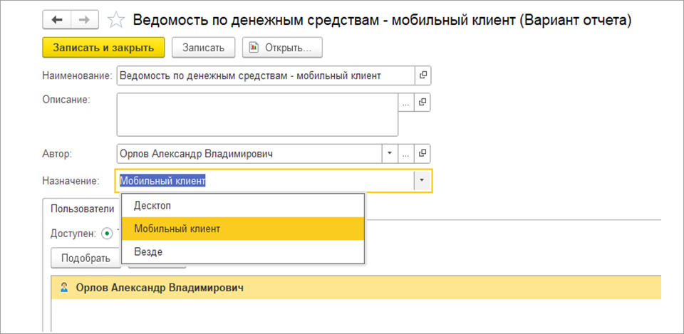 Если переключатель Отображать для десктопа включен, то доступны все варианты отчетов, в том числе с назначением Десктоп. Если переключатель отключен, то доступны варианты отчетов для мобильного клиента с назначением Мобильный клиент и Везде.