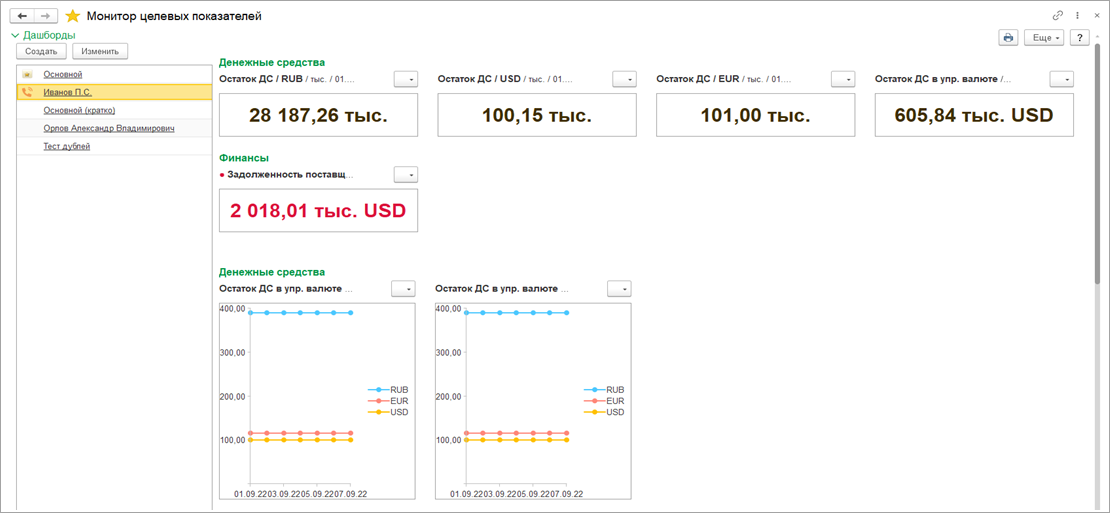 В отчет Монитор целевых показателей (далее - МЦП) добавлено окно Дашборды. В данном окне отображаются элементы справочника Дашборды МЦП, доступные текущему пользователю.