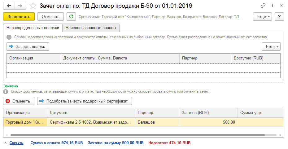 По кнопке Перенести в документ указанные сертификаты будут заполнены в таблице Зачтено формы Помощника зачета оплат. До выполнения зачета оплаты строки с сертификатами не доступны для редактирования. При нажатии на кнопку Выполнить создается документ Взаимозачет задолженности с операцией Оплата подарочным сертификатом розничной продажи. При повторном открытии формы зачета оплаты в таблице будет отображаться ссылка на документ взаимозачета задолженности.