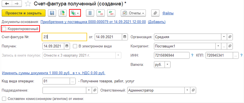 Например, в корректировке приобретения первая строка должна быть отражена в книге продаж, поскольку уменьшается количество купленных товаров, а вторая строка – в книге покупок, поскольку увеличивается количество купленных товаров.