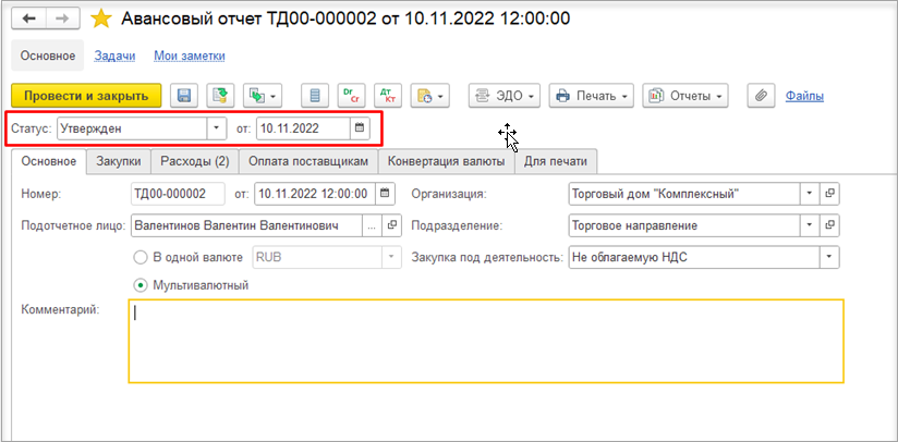 В документ Авансовый отчет добавлена дата для аналитики Статус Утвержден.