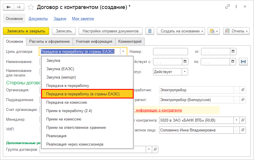 В карточку элемента списка Договоры с контрагентами добавлен новый тип договора Передача в переработку (в страны ЕАЭС).