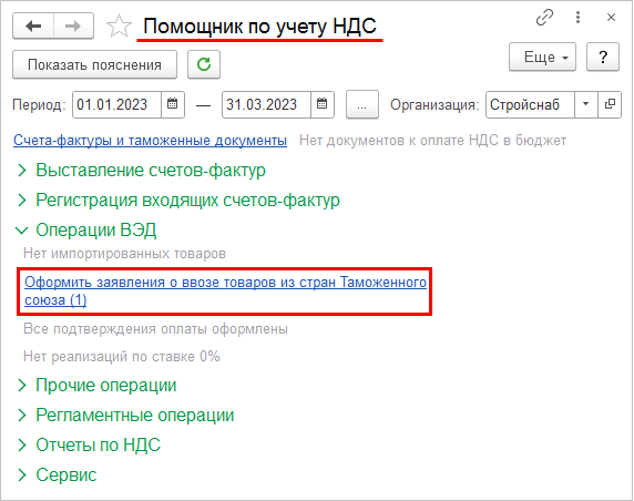 Необходимость оформления документов Заявление о ввозе товаров из ЕАЭС по отчетам переработчика, в которых указаны услуги переработки, отражается в рабочем месте Помощник по учету НДС (меню Финансовый результат и контроллинг – НДС).