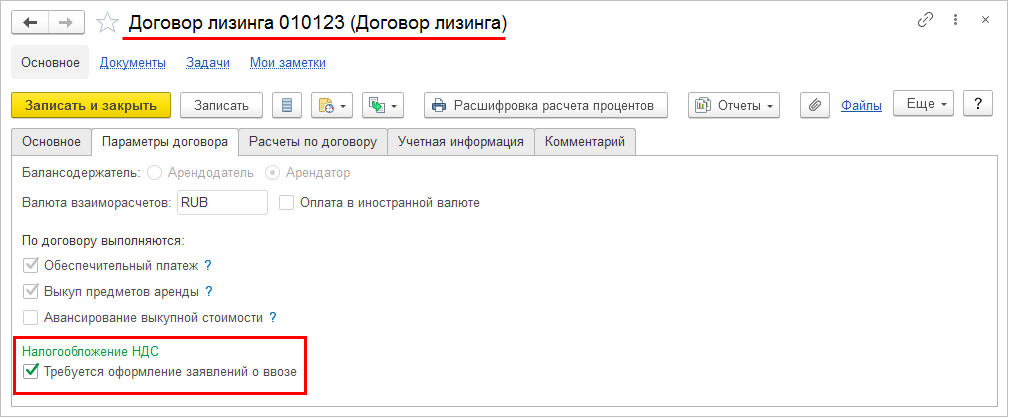 При установке признака Требуется оформление заявлений о ввозе в карточке элемента списка Договоры аренды налогообложение НДС по данному договору определяется как Закупка не облагается НДС, поле Налогообложение скрывается. Вводом на основании договора лизинга можно оформить документ Заявление о ввозе товаров из ЕАЭС.