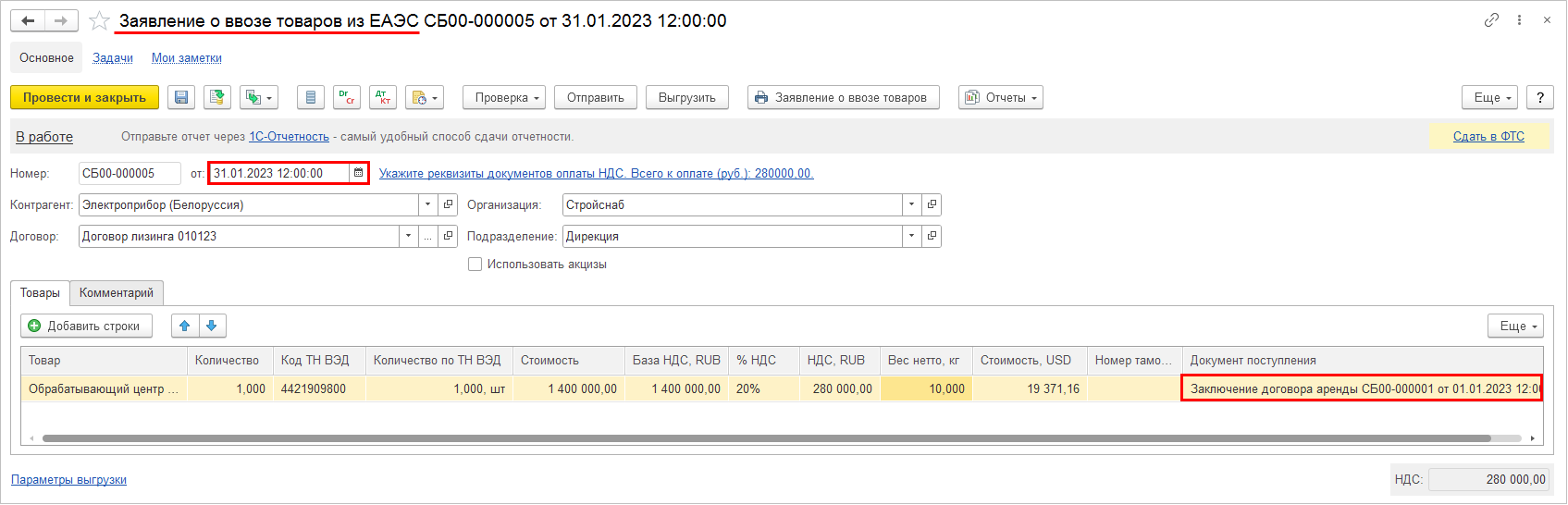 Необходимость оформления документов Заявление о ввозе товаров из ЕАЭС по договорам лизинга определяется наличием записей в регистре накопления Товары к оформлению документов импорта, сделанных документами Заключение договора аренды, Изменение условий договора аренды, Прекращение договора аренды, Выкуп арендованных ОС и отражается в рабочем месте Помощник по учету НДС.