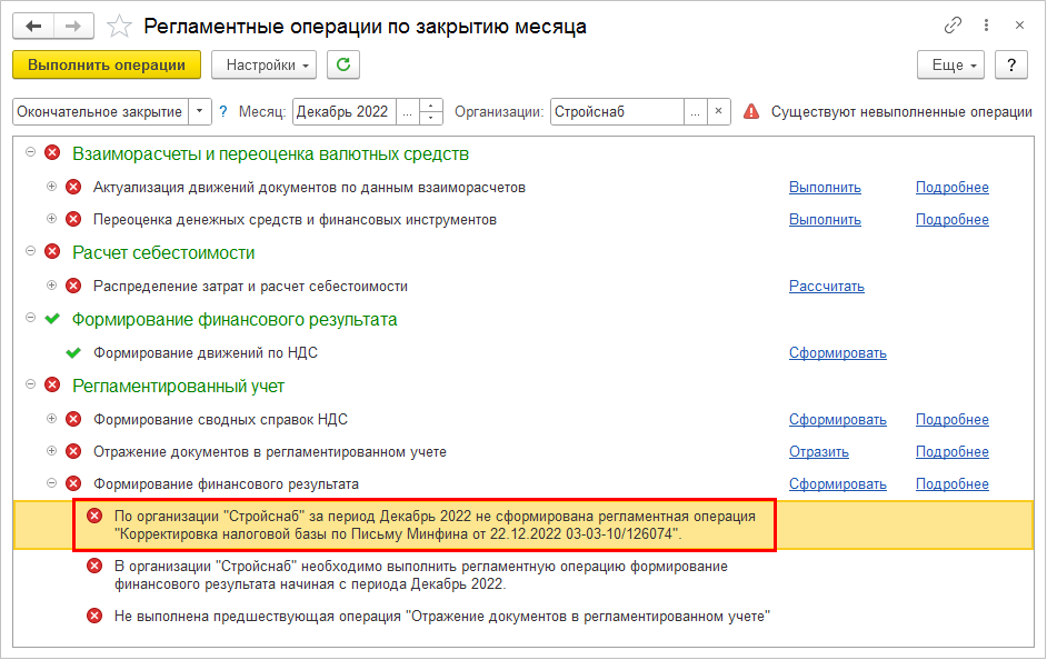 Регламентная операция Корректировка налоговой базы по Письму Минфина от 22.12.2022 03-03-10/126074 выполняется в рамках этапа Формирование финансового результата процедуры Закрытие месяца только в декабре 2022 года.