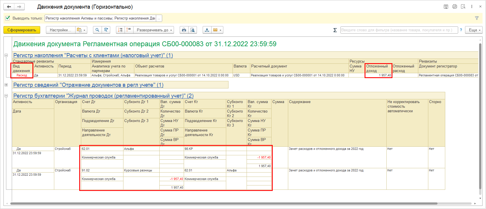 Например, 14.10.2022 года организацией «Стройснаб» контрагенту «Альфа» был оформлен документ Реализация товаров и услуг на сумму 1000 USD по курсу 63,4917 руб. за 1 USD. Была выполнена переоценка задолженности 31.10.2022 по курсу 61,5343 руб. за 1 USD, 30.11.2022г. по курсу 65,0000 руб. за 1 USD и 31.12.2022г. по курсу 70,3375 руб. за 1 USD. Т.о. на 31.12.2022г. сумма накопленного расхода от переоценки составила 1957,40 руб., а сумма отложенного дохода от переоценки составила 8803,20 руб. В соответствии с подходом, изложенным в Письме Минфина, отложенный доход от переоценки должен быть уменьшен на сумму накопленного расхода. При выполнении в декабре 2022г. по организации «Стройснаб» регламентной операции Корректировка налоговой базы по Письму Минфина от 22.12.2022 03-03-10/126074 формируется движение с видом Расход по ресурсу Отложенный доход в регистр оперативного учета расчетов НУ Расчеты с клиентами (налоговый учет) и проводки Дт 91.02 НУ -1957,40 ВР 1957,40 Кт 62.01 и Дт 62.01 Кт 98.КР НУ -1957,40 ВР 1957,40.