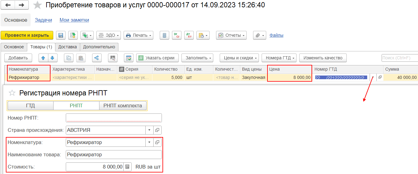 Суммы из УПД указываются в разрезе РНПТ в карточке номера ГТД (для типа номера ГТД РНПТ/РНПТ комплекта).