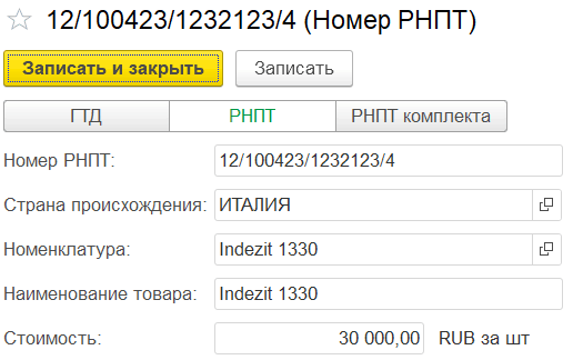В шапке номера ГТД для типов РНПТ/РНПТ комплекта при создании элемента справочника сохраняется номенклатура. Это позволяет отслеживать исходную номенклатуру, независимо от промежуточных действий в базе с этим РНПТ (например, сборок, разборок). Для обычных РНПТ и РНПТ комплектующих также сохраняется стоимость в шапке, справочно.