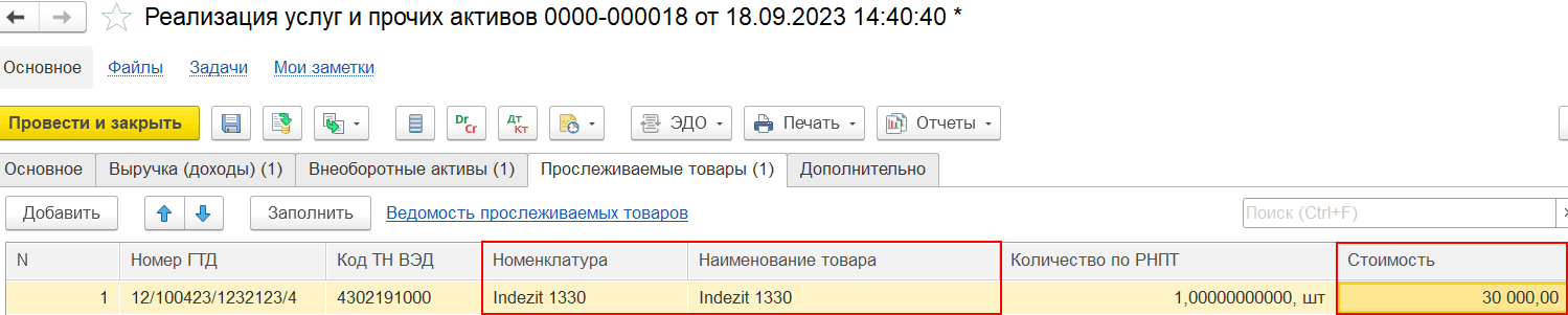 При продаже прослеживаемого товара обязательно использование эУПД/эУКД. При формировании эУПД/эУКД предусмотрена выгрузка информации о прослеживаемых номерах ГТД. Информация о стоимости прослеживаемых номеров ГТД в эУПД заполняется учетными данными в соответствии с информацией карточки прослеживаемого номера ГТД, если таковой подобрался в табличной части «Виды запасов» реализации.