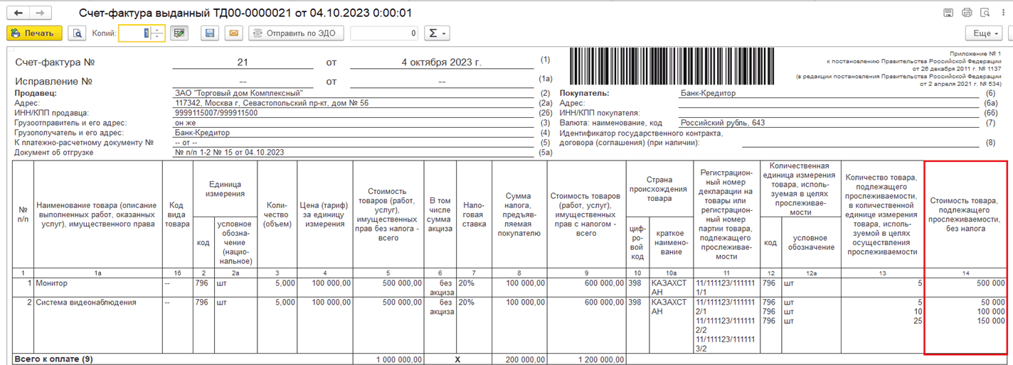 При реализации стоимость прослеживаемого товара выводится в графу 14 «Стоимость товара, подлежащего прослеживаемости, без налога» счета-фактуры.