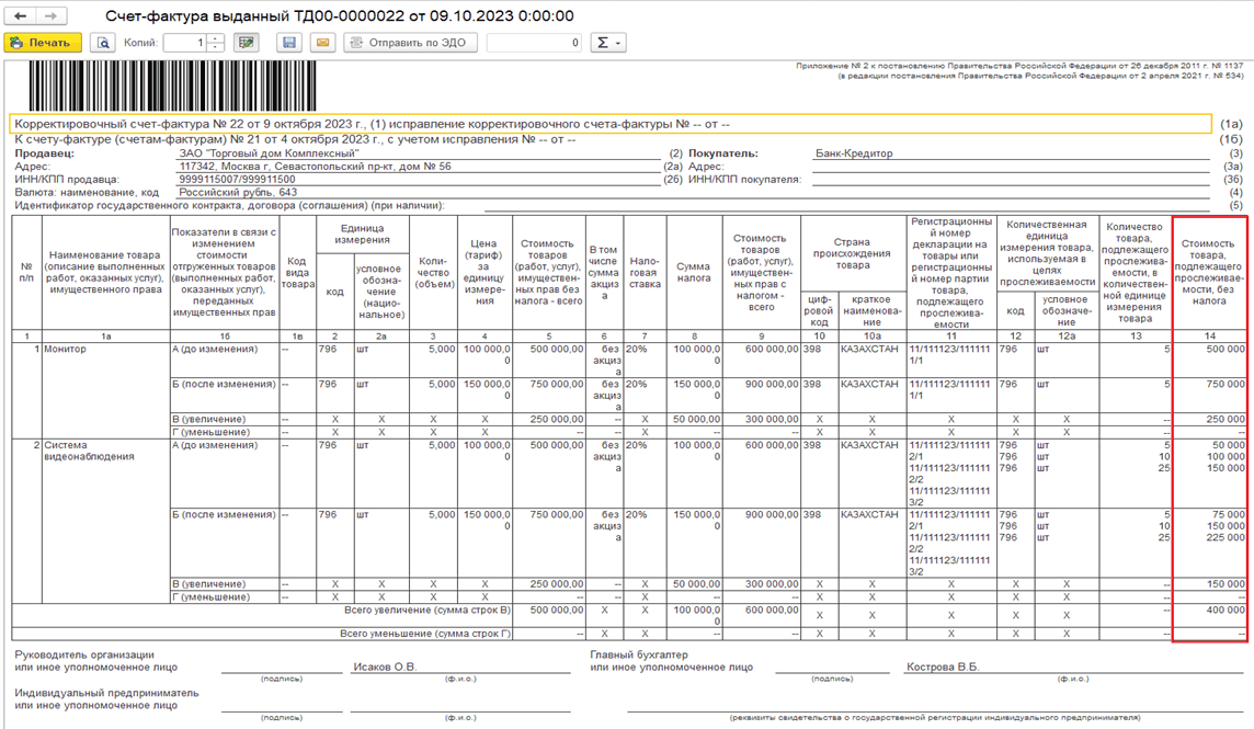 Для СФ/КСФ/УПД/УКД добавлена графа 14 «Стоимость товара, подлежащего прослеживаемости, без налога», которая: