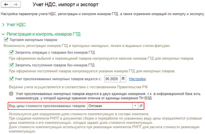 Вид цены стоимости прослеживаемых товаров определяется по ссылке НСИ и администрирование – Учет, НДС, импорт и экспорт – Регистрация и контроль номеров ГТД – Вид цены стоимости прослеживаемых товаров. Вид цены используется для определения доли стоимости комплектующих в составе комплекта. При создании комплекта по указанному виду цены определяются условные цены комплекта и его комплектующих, которые задают доли стоимости комплектующих. Доли стоимости комплектующих используются при реализации комплектов РНПТ для расчета стоимости реализации комплектующих.