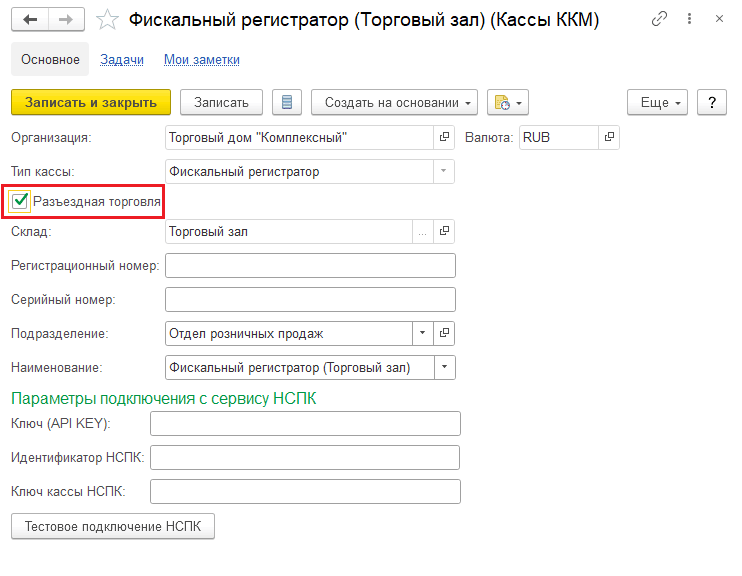В форме элемента справочника Кассы ККМ предусмотрен флаг Разъездная торговля.