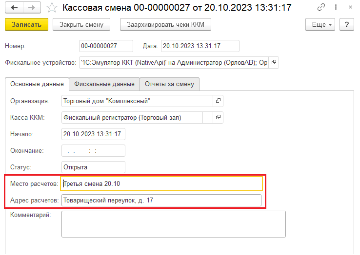 Реквизиты Адрес расчетов и Место расчетов отображаются в форме кассовой смены и их можно изменять в течение кассовой смены.