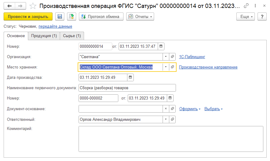 Производство ПАТ для целей ФГИС Сатурн отражается документом Производственная операция ФГИС "Сатурн". Создать документ можно по ссылке Создать производственную операцию ФГИС "Сатурн" из документов подсистемы Производство или документа Сборка(разборка) товаров, а также из рабочего места Обмен с ФГИС "Сатурн" по ссылке Создать в строке Производственные операция ФГИС "Сатурн" или непосредственно из списка Производственные операция ФГИС "Сатурн" на закладке К оформлению. В созданном документе автоматически заполняется организация по классификатору ФГИС "Сатурн" и адрес места хранения по данным сопоставления классификаторов и (или) ИНН и КПП.