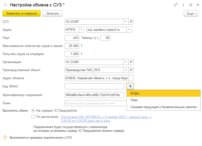 Также в панели НСИ и администрирование – Администрирование - Интеграция с ИС МП (обувь, одежда, табак…) предусмотрен флаг Фоновая проверка электронных документов. При установке этого флага после каждого изменения УПД, УКД или чека будет автоматически запущена проверка документа на соответствие требованиям ГИС МТ, а результаты этой проверки обновляются на форме документа. Если данная опция отключена, то проверка может быть выполнена вручную, по гиперссылке на форме документа, или описанным выше регламентным заданием по настроенному расписанию.