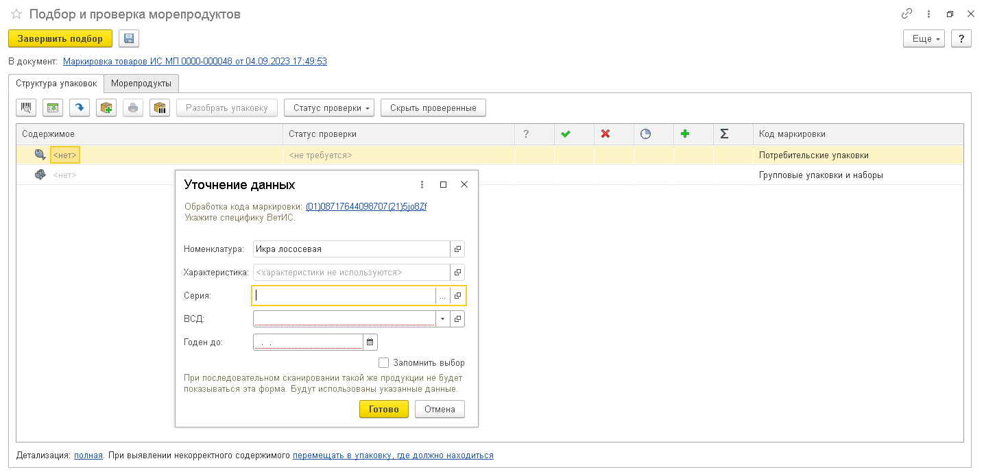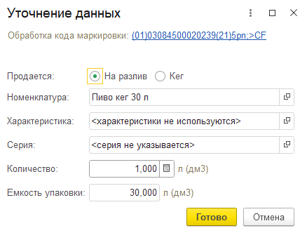 При сканировании кода GTIN (штрихкода EAN-13) отображается форма Уточнения данных, в которой нужно указать Код маркировки кега, а также Количество пива, продаваемого в розлив.