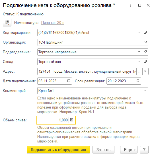 По кнопке Подключить оборудование информация о подключении кега к оборудования сохраняется в информационной базе и код маркировки кега будет доступен для продажи.