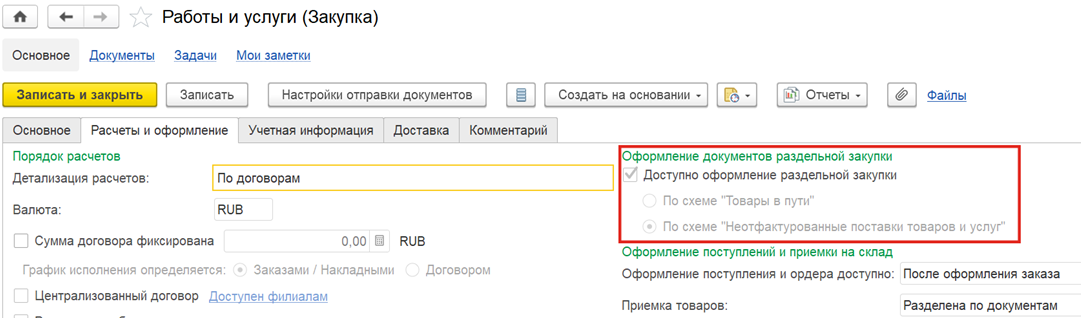 Для возможности оформления закупки по неотфактурованным поставкам услуг (работ) должен быть зарегистрирован договор с поставщиком, в котором устанавливается настройка Доступно оформление раздельной закупки и выбирается схема закупки по неотфактурованной поставке.