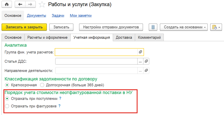 Для управления отражением неотфактурованных поставок в НУ по прибыли в договоре с поставщиком с целью «Закупка», «Закупка (ЕАЭС)» на закладке Учетная информация предусмотрена настройка Порядок учета стоимости неотфактурованной поставки в НУ, действующая на отражение товаров, услуг и работ.