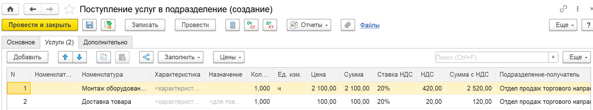 Для отражения неотфактурованной поставки услуг (работ) добавлен новый документ Поступление услуг в подразделение, который является аналогом документа Поступление товаров на склад. В документе Поступление услуг в подразделение предусмотрен выбор номенклатуры с типом «Работа», «Услуга».