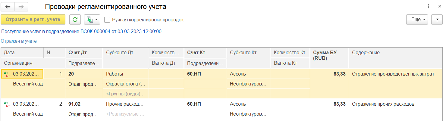 При поступлении услуг (работ) в подразделение в бухгалтерском учете формируются проводки:
