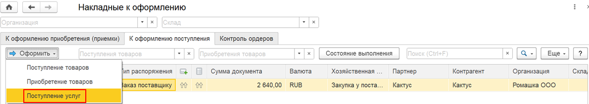 Документ Поступление услуг в подразделение можно оформить на основании документа Заказу поставщику, в рабочем месте Накладные к оформлению на закладке К оформлению поступления по команде Оформить – Поступление услуг или вручную из списка документов Закупки – Закупки – Документы закупки (все).