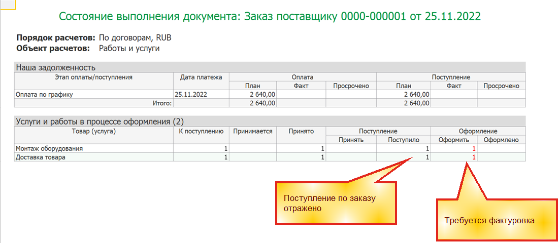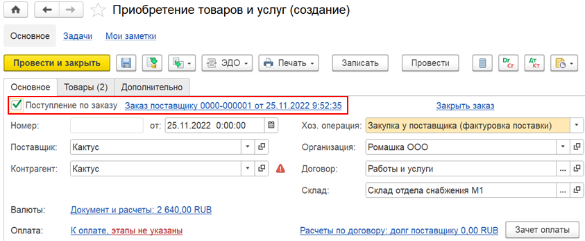 При неотфактурованных поставках услуг (работ) поддерживается отражение операций «Закупка у поставщика, «Ввоз из ЕАЭС». Оформление закупки при неотфактурованной поставке услуг (работ) отражается двумя документами: