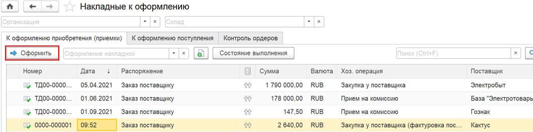 Документ Приобретение товаров и услуг можно оформить на основании документа Заказу поставщику, в рабочем месте Накладные к оформлению на закладке К оформлению приобретения (приемки) по команде Оформить или вручную из списка документов Закупки – Закупки – Документы закупки (все).