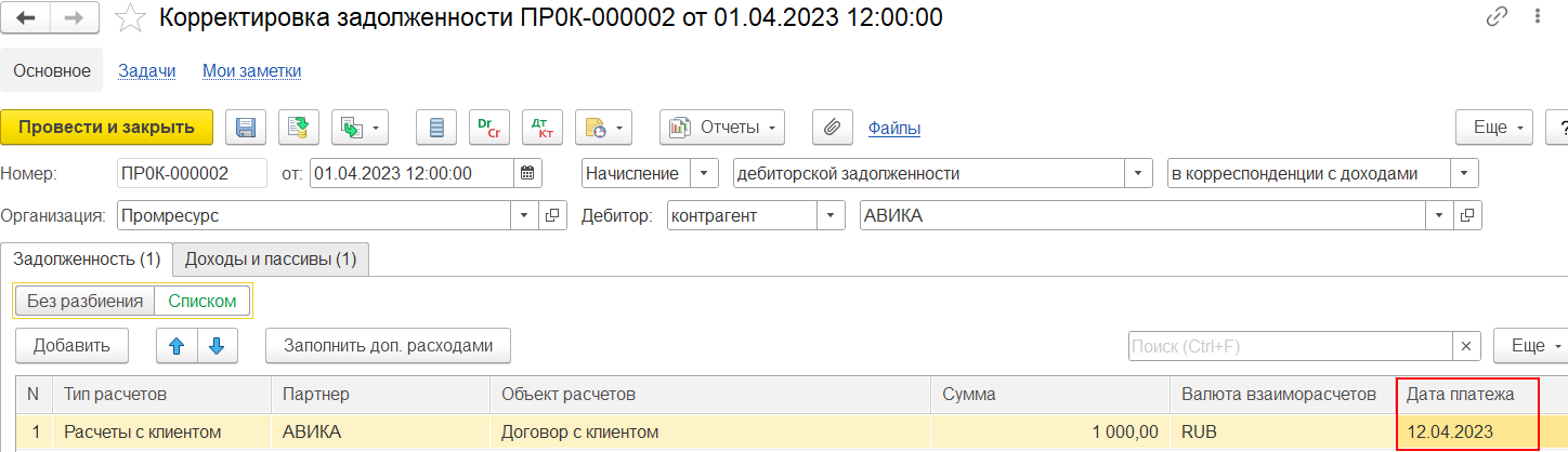 При начислении дебиторской задолженности клиента и начислении кредиторской задолженности поставщика в документе корректировки задолженности на закладке Задолженность доступно обязательное для заполнения поле Дата платежа. По умолчанию поле будет заполнено датой документа при записи, проведении документа. От даты платежа будет рассчитываться просрочка задолженности.