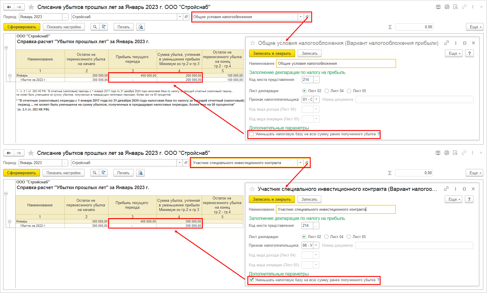 Например, у организации настроены 2 варианта налогообложения прибыли «Общие условия налогообложения» и «Участник специального инвестиционного контракта». В карточке варианта «Общие условия налогообложения» признак Уменьшать налоговую базу на всю сумму ранее полученного убытка не установлен, в карточке варианта «Участник специального инвестиционного контракта» - установлен. На начало 2023 года сумма перенесенного на будущее убытка за 2022 год по каждому варианту налогообложения составляет 300 000 руб. Прибыль за январь 2023 года по каждому варианту налогообложения составляет 400 000 руб. При выполнении регламентной операции Списание убытков прошлых лет в рамках процедуры Закрытие месяца налоговая база по варианту налогообложения «Общие условия налогообложения» будет уменьшена на 50% прибыли, т.е. на 400 000 х 0,5 = 200 000 руб. По варианту налогообложения «Участник специального инвестиционного контракта» - без учета ограничении 50% налоговой базы, т.е. на всю сумму убытка 300 000 руб.