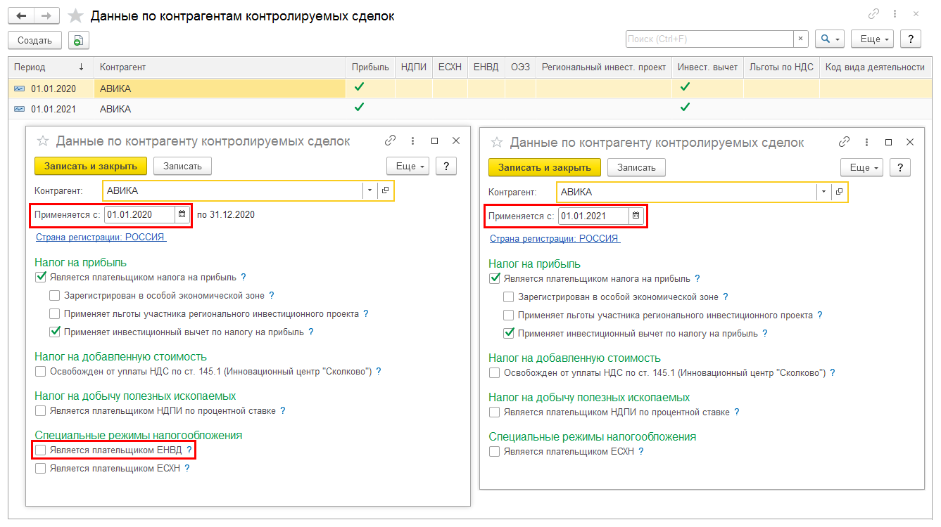 Из данных по контрагенту контролируемых сделок, действующих с 01.01.2021 и позже исключена настройка Является плательщиком ЕНВД. Если по контрагенту применяются настройки, действующие с периода ранее 01.01.2021 и в них настройка Является плательщиком ЕНВД включена, тогда при формировании уведомления о контролируемых сделках за период с 2021г. и позднее указанная настройка не учитывается.
