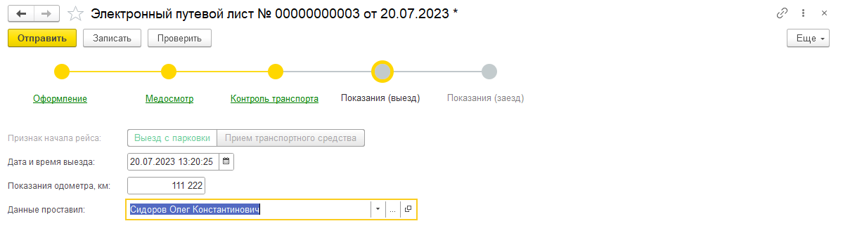 На следующем шаге вносятся показания одометра при выезде транспортного средства. После внесения показаний производится подписание и отправка данных оператору ЭДО по кнопке Отправить.