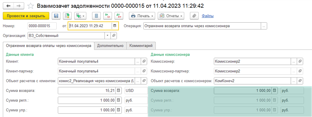 Для документа Взаимозачет задолженности с операциями Отражение оплаты через комиссионера, Отражение возврата оплаты через комиссионера добавлены поля «Сумма регл.», «Сумма упр.». Сумма оплаты заполняется в валюте взаиморасчетов. Предусмотрено изменение суммы взаиморасчетов (суммы оплаты/сумма возврата), суммы регл. и суммы упр. учета.