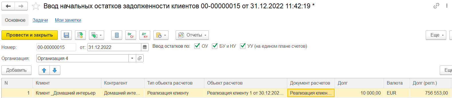 Если в документе ввода остатков задолженности указан клиент/партнер = конечный клиент и объект расчетов = договор с клиентом, то возникает долг клиента перед комитентом по договору с клиентом.