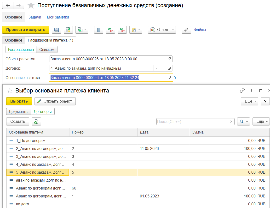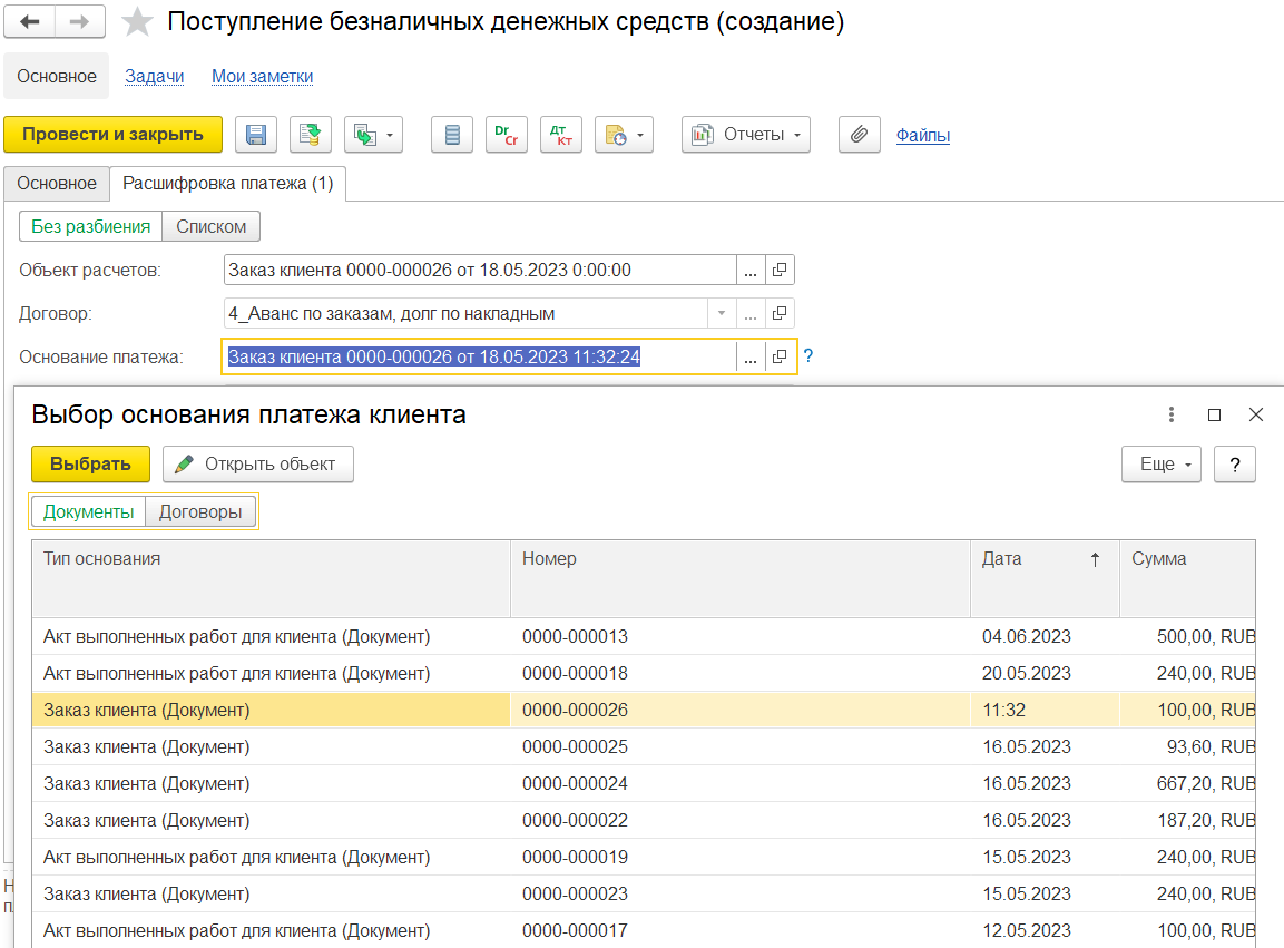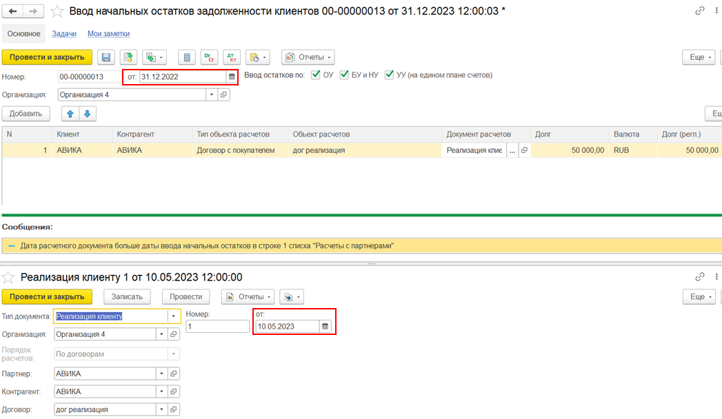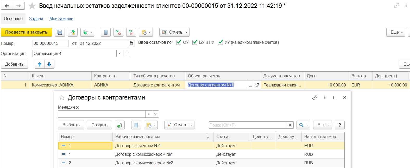Если в документе ввода начальных остатков задолженности указан клиент/партнер = комиссионер и объект расчетов = договор с клиентом, то возникает долг комиссионера перед комитентом по договору с клиентом. В первичном документе Реализация клиенту на выбор доступен договор с клиентом.