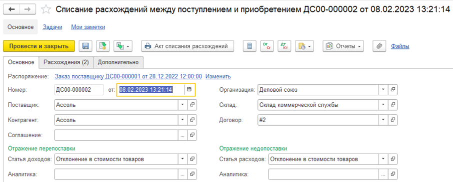 В случае выбора в документе Акт о расхождениях после поступления вариантов отработки расхождений Списать за наш счет (при недопоставке, расхождения между поступлением и приобретением относятся на прочие расходы) и На прочие доходы (при перепоставке, расхождения между поступлением и приобретением относятся на прочие доходы, документы не переоформляются) по данным акта о расхождениях будет создан документ Списание расхождений между поступлением и приобретением.