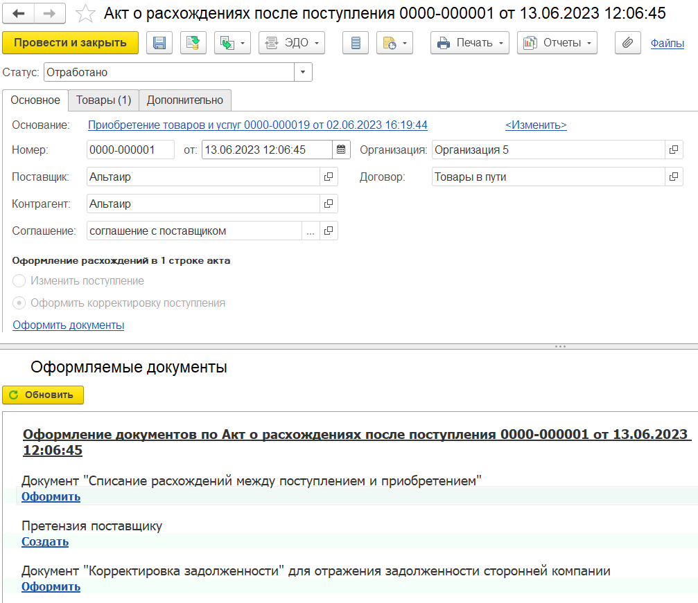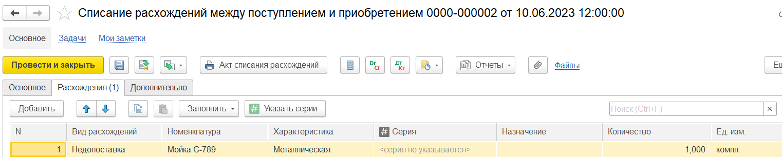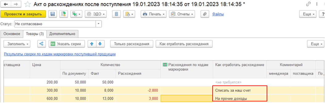 Одним документом могут быть списаны расхождения разных видов (недопоставка, перепоставка).