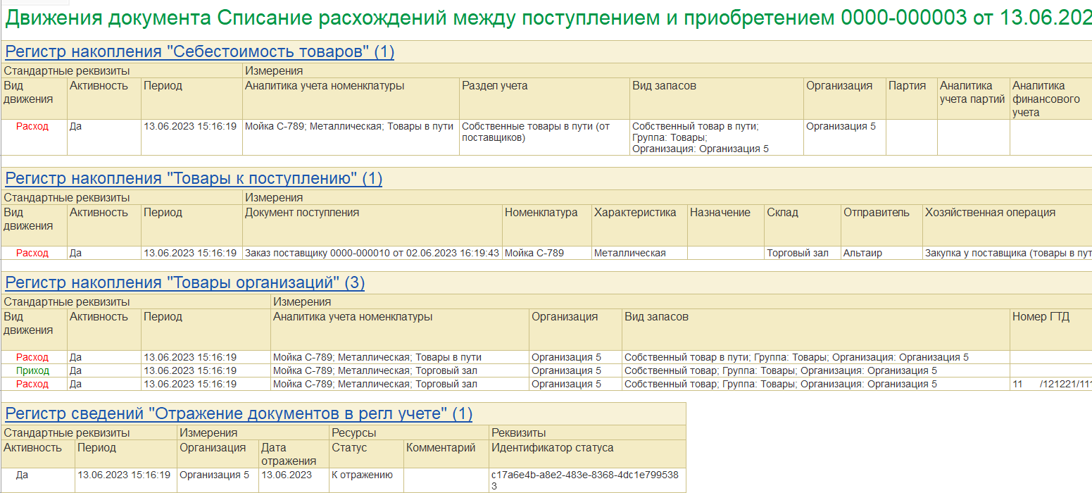 Движения документа Списание расхождений между поступлением и приобретением до расчета себестоимости в рамках закрытия месяца: