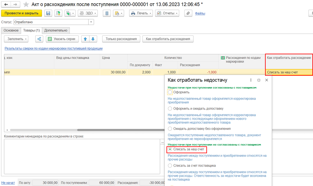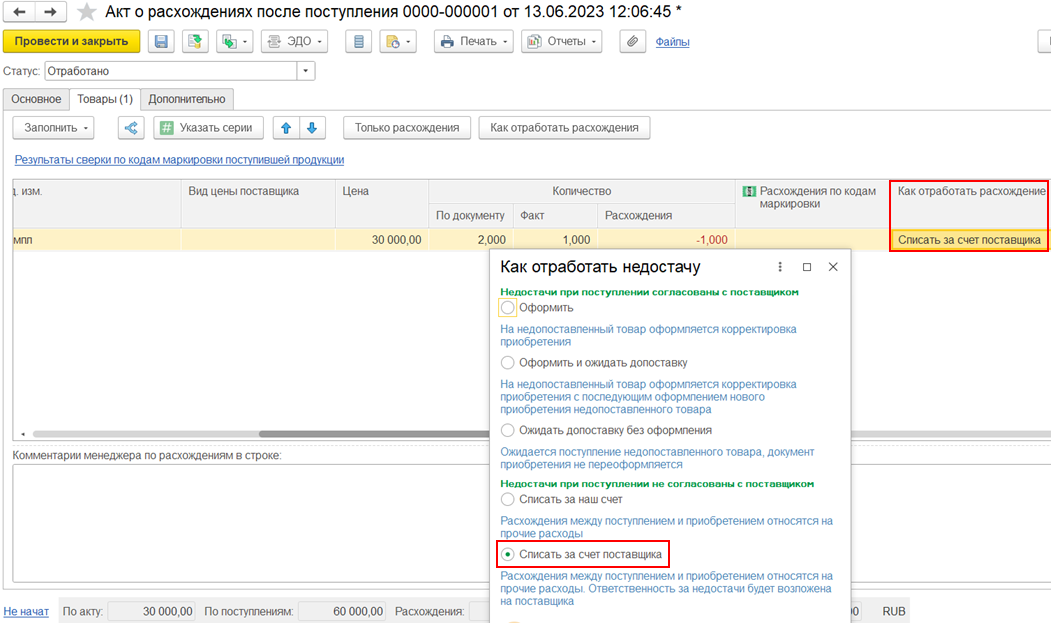 В случае выбора варианта отработки расхождения Списать за счет поставщика (при недопоставке, расхождения между поступлением и приобретением относятся на прочие расходы, ответственность за недостачи возлагается на поставщика), будет создан документ Списание расхождений между поступлением и приобретением с последующем переносом расходов на расчеты с поставщиком по претензии.