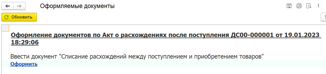 Документ Списание расхождений между поступлением и приобретением может быть оформлен по данным документа Акт о расхождениях после поступления. Акт о расхождениях после поступления можно ввести на основании документа Приобретение товаров и услуг.