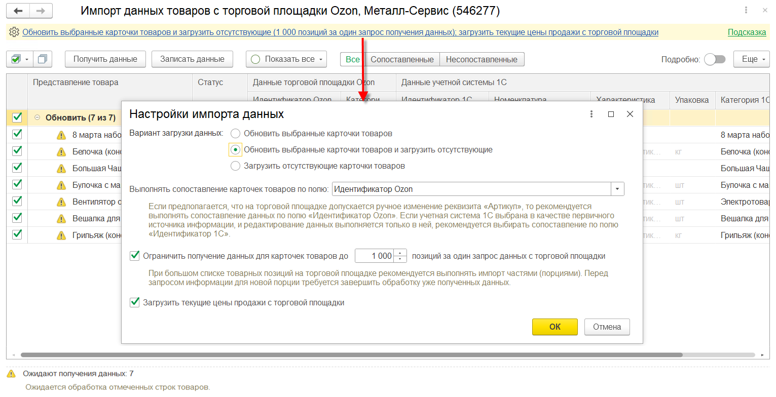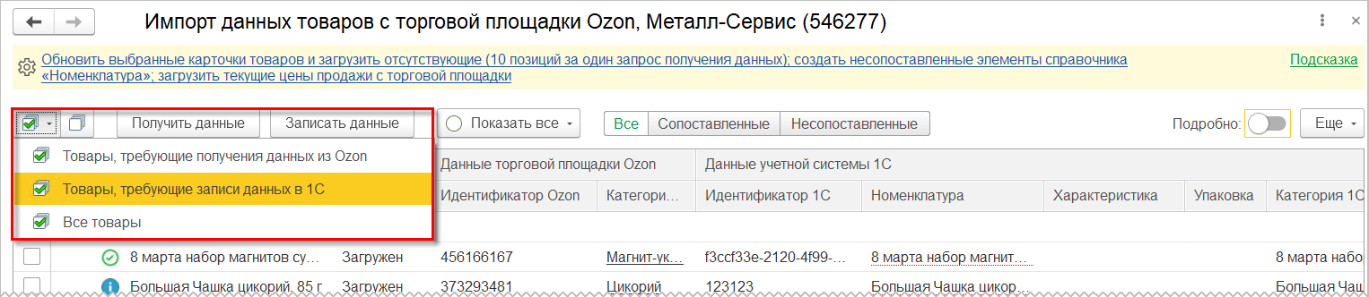 Сопоставление необходимо для обновления цен и остатков, а также для указания номенклатуры информационной базы при выгрузке и загрузке документов. Загрузка полной информации о товарах с площадки маркетплейса позволит в дальнейшем управлять товарным каталогом торговой площадки из информационной базы: редактировать описание товаров в информационной системе и выгружать на торговую площадку.