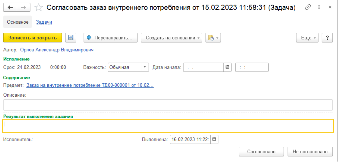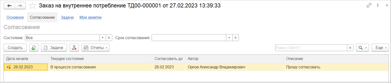 Согласование производится в рамках бизнес-процесса Согласование заказа на внутреннее потребление, на форме которого предусмотрено отображение блок-схема процесса. В рамках бизнес-процесса на ответственного за согласование автоматически создается задача.