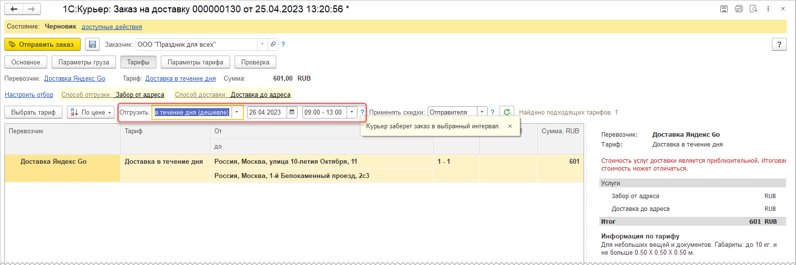 При отправки отдельного заказа подержана возможность выбора наиболее выгодных тарифов «в течение дня», а также улучшена форма подбора тарифа и указания параметров тарифа в форме заказа и в Помощнике отправки заказов.