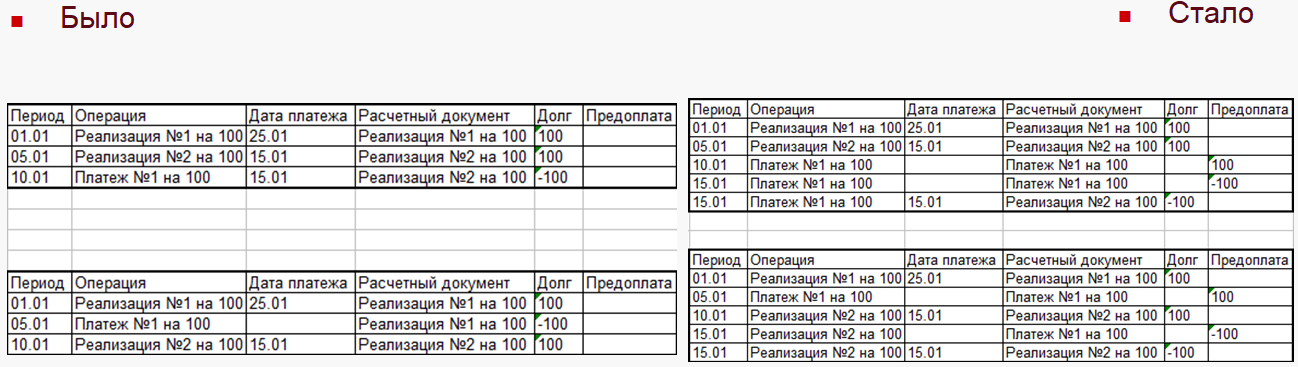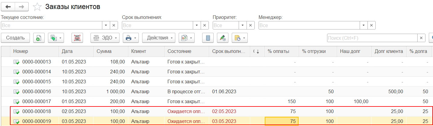 Переделан алгоритм расчета % оплаты по заказу в списке заказов клиентов, заказов поставщикам при детализации расчетов «Аванс по заказам, долг по накладным». При расчете процента оплаты учитывается сумма всех оплат по заказу и накладным по этим заказам. Переносы авансов с заказов на накладные считаются оплатой по накладной. Сумма оплат по накладной распределяется пропорционально по заказам-основаниям.